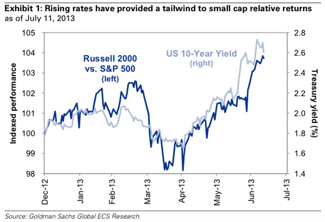 Graf srovnávající poměr Russell 2000 a S&P 500 s výnosy 10letých amerických dluhopisů mu v tomto smyslu dává za pravdu - s růstem úroků (v reakci na možnost, že Fed omezí QE) se lépe dařilo akciím menších amerických firem.