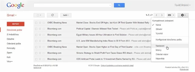 Pro aktivaci většiny z následujících funkcí budete potřebovat pracovat s nastavením Gmailu. K němu vede cesta přes ozubené kolečko v pravém horním rohu vaší e-mailové schránky.