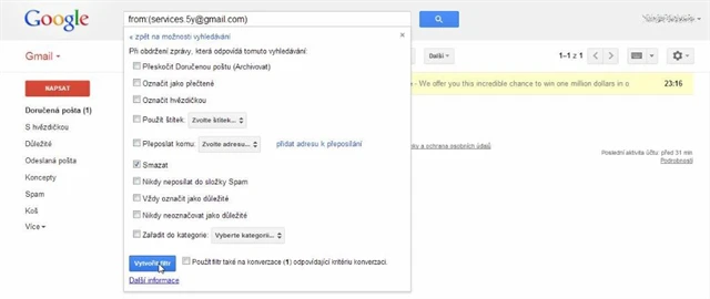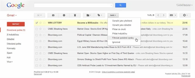 Pokud ochranu soukromí podceníte a vaše osobní či pracovní adresa se dostane do rukou spammerů, je většinou jedinou možností, jak v e-mailu znovu nastolit pořádek, filtrování nevyžádané pošty. V Gmailu stačí nevyžádanou zprávu označit a přes tlačítko Další zvolit Filtrovat podobné zprávy. Poté již záleží pouze na vás, co se se zprávami tohoto příjemce rozhodnete udělat. Nejlepší volbou je samozřejmě jejich okamžité smazání.