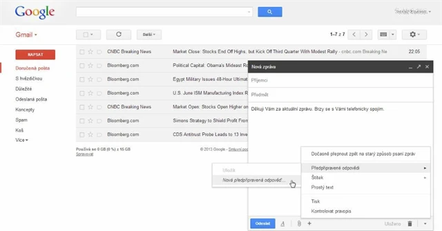 Také ztrácíte nervy, když musíte několika různým lidem během jediného dne odesílat stále dokola tu samou odpověď? Pak jsou předpřipravené odpovědi přesně pro vás. Můžete si připravit několik verzí různých e-mailů a ty ze své schránky tahat jako králíky z klobouku. Předpřipravené odpovědi uložíte pomocí nabídky, kterou vyvoláte kliknutím na šipku v pravém spodním rohu okna s rozepsanou zprávou. Divili byste se, kolik času díky předpřipraveným odpovědím ušetříte.