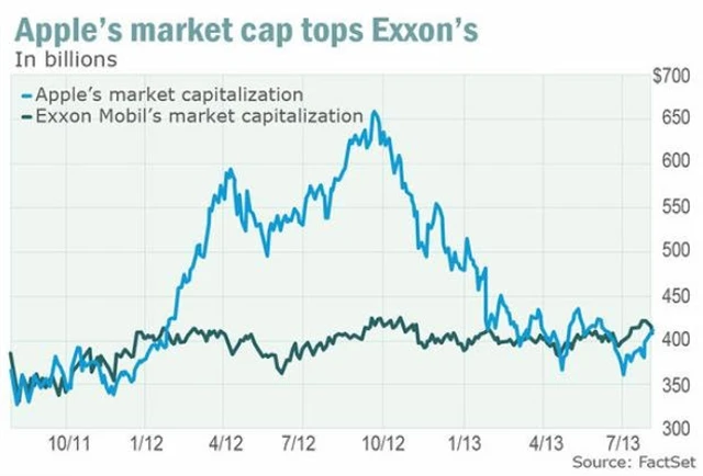 Technologický gigant Apple se ve čtvrtek opět stal společností s největší tržní kapitalizací na světě. Již poněkolikáté si tak roli světové jedničky vyměnil s ropným Exxon Mobilem, jehož akcie ztrácely v reakci na horší než očekávané finanční výsledky. Při poklesu o 1,10 % se tržní kapitalizace Exxonu snížila na 412 miliard USD, Apple naopak posílil o 0,92 %, čímž svoji tržní kapitalizaci zvýšil na 414,8 miliardy USD.