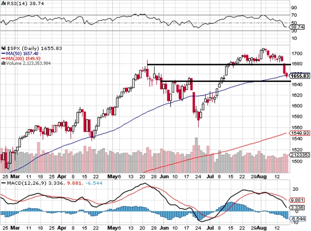 Závěr: Index S&P 500 ve čtvrtek přišel o více než 1 %. Objem obchodů zůstal průměrný, ani v pátek se při dalším sestupu nezvýšil. Od historického maxima ze začátku srpna se jedná o pokles pouze o 3,2 % a vývoj zatím nenaznačuje ukončení 4letého býčího trhu. Zřejmě ale bude chvíli trvat, než se index vrátí nad 1 700 bodů.