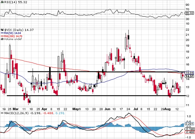Přes páteční pokles indexu S&P 500 index VIX poslední obchodní den mírně klesl a nepřekonal hladinu 15 bodů. Jde asi o jediné pozitivum uplynulého týdne. Další růst indexu volatility nad 15 by znamenal breakout z rozpětí a pro akciový trh negativní signál.