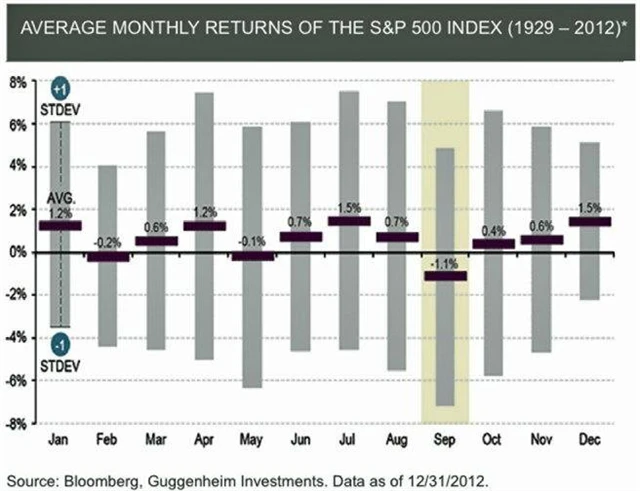 Historie není nejlepším rádcem investorů, i tak se ovšem většina trhu ohlíží za tím, jak se v minulosti obchodovalo v různých obdobích. V průměru jsou na tom americké akcie nejhůře právě v září. kromě jiných na to upozorňuje Scott Minerd z Guggenheim Partners. "Od roku 1929 hlavní americký index během září v průměru ztrácel 1,1 %, první podzimní měsíc je jeden z pouhých tří, které dlouhodobě vykazují negativní akciovou návratnost," píše investiční ředitel své společnosti.