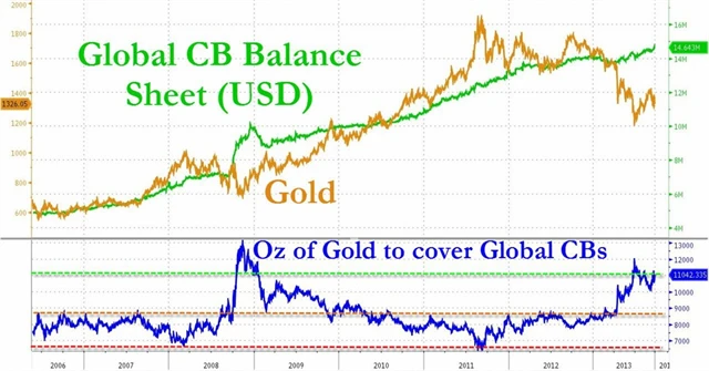 Nafouklé bilance centrálních bank zlatu přejí. Nejen Fed, ale také ostatní centrální banky potřebují nějakou hodnotovou kotvu pro své rozvahy. Poměr rozvah centrálních bank k ceně zlata je přitom na extrémní úrovni. Pro "stabilní" vztah mezi rozvahou centrální banky a zlatem by měla být jeho cena zpět na 1 800 USD za unci.