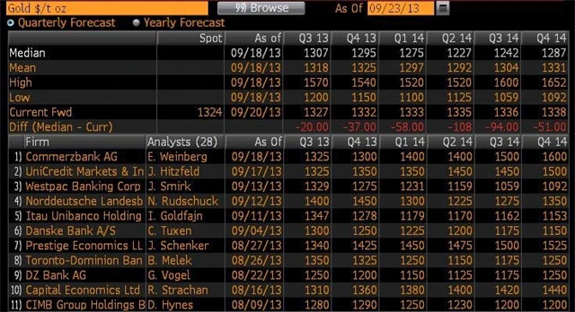 Jesper Dannesboe a Robin Bhar, analytici ze Société Générale, pochybují, že by čtvrteční skok ve spotové ceně zlata značil oživení na zlatě. Spíše jen potrápil ty, kteří sázejí na pokles. "Odložení redukce programu kvantitativního uvolňování nemění nic na tom, že většina fundamentů mluví v neprospěch zlata. Oznámení Fedu nanejvýš oslabilo medvědí scénáře, ale ne do té míry, jaká by zvrátila sestupný trend ceny zlata," napsali ve svém reportu. "Očekáváme cenu zlata v prvním čtvrtletí 2013 kolem 1 225 USD s dalším poklesem k 1 100 USD během roku 2014. Doporučujeme investorům využívat současnou rally na zlatě jako prodejní příležitost."