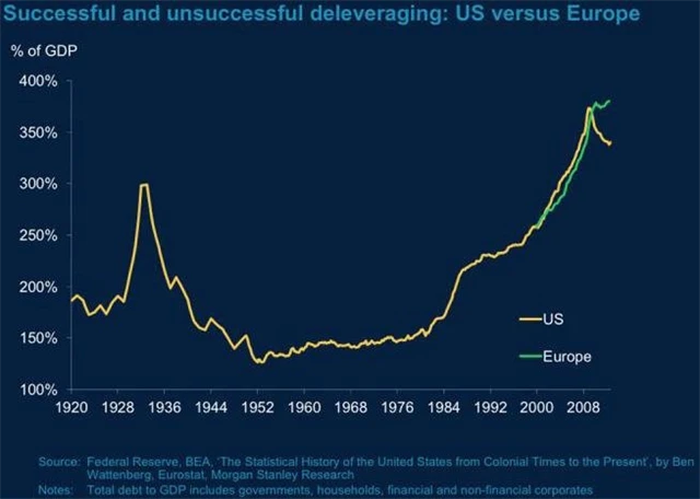 Někomu se daří míru zadlužení snižovat, někomu ne. Navzdory růstu dluhu Spojených států v poměru k HDP na tom celkově americká ekonomika je lépe než ta evropská, pokud jde o zadlužení. V součtu totiž americký stát, firmy a domácnosti v posledních letech dokázaly z dluhu alespoň část ubrat, zatímco v Evropě míra zadlužení zhruba stagnuje. To vše při rychlejším růstu americké ekonomiky. Míra zadlužení v poměru k HDP ale na obou březích Atlantiku dlouhodobě roste.
