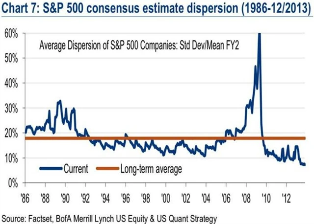"Ve výhledu na výsledky za čtvrtý kvartál měli analytické týmy ve svých očekáváních rozptyl zhruba 7 % po 8 % v předchozím čtvrtletí. Průměr jen přitom okolo 18 %," upozorňuje Savita Subramanian, která zodpovídá za americkou akciovou startegii v Bank of America Merrill Lynch. "Podle nás nejsou analytici ochotní se příliš odlišovat od konsenzu trhu."