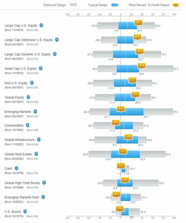 Zajímavé je, že rok 2013 byl plný extrémů. Většina aktiv se totiž nachází na horním okraji dlouhodobého rozpětí (akcie s velkou kapitalizací, defenzivní akcie, akcie malých firem v USA i světové akcie), nebo na spodním okraji (rozvíjející se trhy, komodity, hotovost, americké dluhopisy).