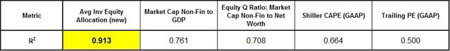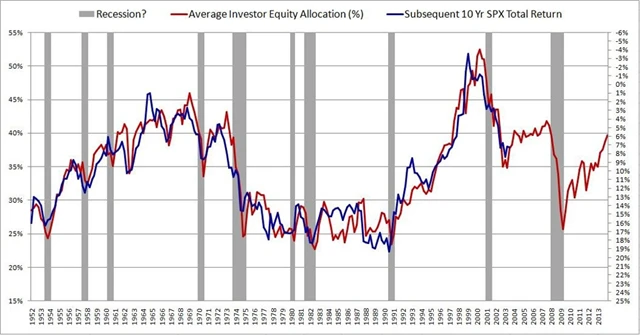 Uvedená nepřímá úměra je jako indikátor extrémně spolehlivá. Červeně je zobrazena průměrná alokace investorů v akciích, modře pak následný 10letý průměrný výnos z akcií zahrnutých v indexu S&P 500.