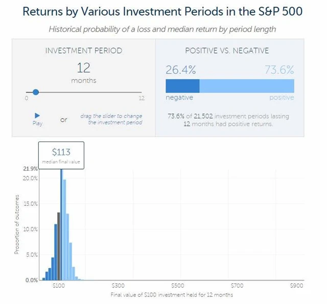 Příklad: Od roku 1928 do roku 2014 existovalo 21 502 období s délkou 12 měsíců. V plusu přitom skončilo 74 % z těchto 21 502 období a mediánový výnos je 13 USD z každých investovaných 100 USD. Čím delší období přitom zvolíte, tím vyšší medián výnosů dostanete. Třeba obdobích s délkou 12 let bylo od roku 1928 přesně 18 730. Výnos ze 100 USD byl dodatečných 240 USD.