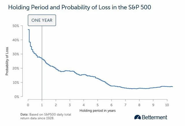 Následující graf ukazuje, že čím déle držíte akcie, tím více klesá riziko ztráty. Na grafu vidíte vztah mezi délkou investice do indexu S&P 500 a pravděpodobností, že se vaše investice znehodnotí.