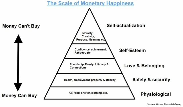 Pokud bychom si štěstí představili jako pyramidu, tvořily by její základnu běžné věci umožňující prosté přežití, tedy přístup k potravinám, bydlení, oblečení a podobně. Jakmile jsou uspokojeny základní potřeby, nastupují požadavky na kvalitní zdravotní péči či zajímavou práci. V této úrovni ještě člověku peníze dokáží pomoci, dále již je ale jejich význam minimální.