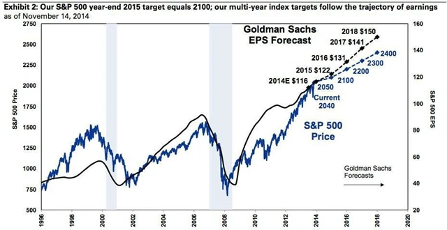 Akciový stratég Goldman Sachs David Kostin představil svůj výhled vývoje indexu S&P 500 na rok 2015. Jeho cílová hodnota je 2 100 bodů. V době zpracovávání to znamenalo zhruba 5% růstový potenciál. Banka očekává nadprůměrný ekonomický růst, který povede k podprůměrné volatilitě a rozptýlení výnosů mezi jednotlivé akciové kategorie. Podle Kostina tak výkon aktivně řízených fondů bude zklamáním.
