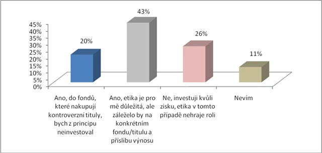 Více než čtvrtina Čechů by se nezdráhala vložit peníze do podílových fondů, které nakupují kontroverzní tituly. Investují kvůli zisku, takže to, zda má daný titul špatnou pověst nebo podniká v eticky sporném odvětví, pro ně nehraje roli. Pro většinu Čechů však etická rovina v investování význam má – pětina by do kontroverzních titulů neinvestovala z principu nikdy, dalších 42 % dotázaných by se rozhodovalo podle konkrétního titulu a příslibu výnosu.