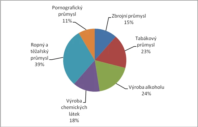 Při pohledu na konkrétní odvětví by Češi byli nejbenevolentnější k ropnému a těžařskému průmyslu, kam by se nezdráhalo investovat 39 % dotázaných. Zhruba čtvrtina respondentů nemá problém ani s investicí do výroby lihovin a tabákových výrobků. Nejproblematičtější je pro české investory pornografický průmysl, do kterého by určitě neinvestovala téměř polovina z nich, a také výroba zbraní (26 %).