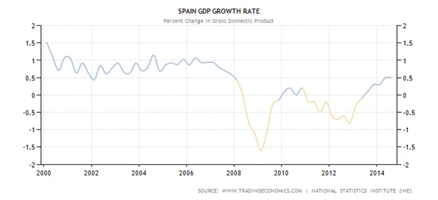 Reálný HDP Španělska se nyní pohybuje v pozitivním teritoriu. Na oživení to tedy podle všeho vypadá, i když 0,5% růst není nijak robustní. Skeptici to stále nazývají spíše stagnací.