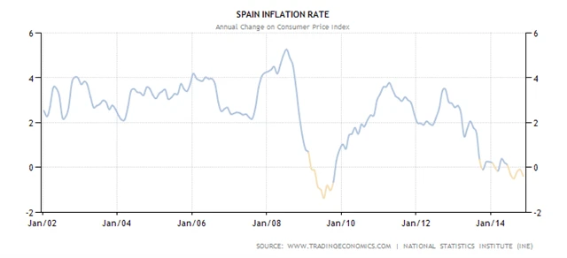 Oranžová linie úplně vpravo značí deflaci. Index spotřebitelských cen ve Španělsku klesá podle posledních údajů zhruba o 0,5 %.