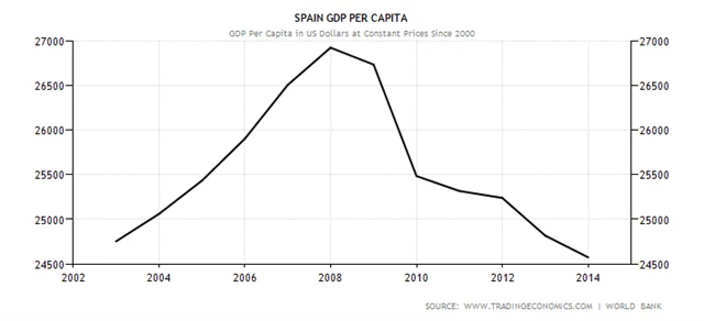 Následující graf ilustruje HDP na obyvatele. Španělsko je na tom hůře než v roce 2003. K "oživení" dochází tedy hlavně díky klesajícím cenám, které zlepšují reálný HDP.