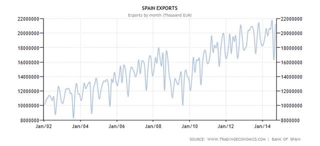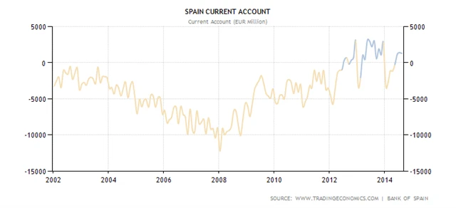 Pohled na španělský běžný účet působí na první pohled pozitivně. Je mírně v plusu, což by mohlo indikovat přebytek obchodní bilance. Důležitější ale je, že velké nerovnováhy, který vznikly před krizí v roce 2008 vlivem přílivu kapitálu do nafouknutého španělského stavebního sektoru, se vyrovnávají a země má dnes daleko zdravější běžný účet než před šesti lety.