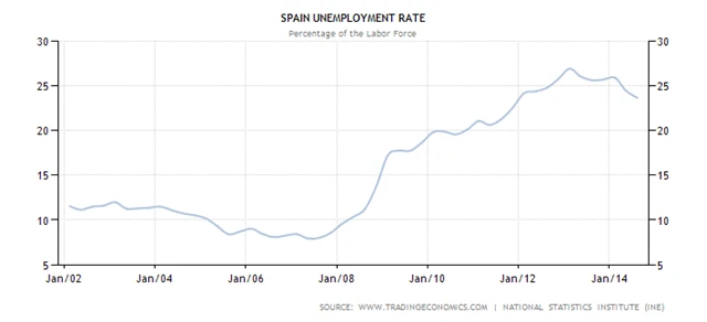 Španělská míra nezaměstnanosti začíná klesat. Není ale jasné, kolik z toho má na svědomí emigrace. S 23 % dospělých nezaměstnaných a ještě dvojnásobným číslem u 18-24letých jde o běh na dlouhou trať. Nikdo nedokáže odhadnout, zda se někdy španělská míra nezaměstnanosti vrátí na předkrizové úrovně. Poslední předpověď OECD udržitelné míry nezaměstnanosti (neakcelerující inflaci) je nyní pro Španělsko 18,9 %.