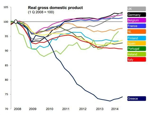 Po něm část Řeků a světových ekonomů volala, eurozóna však byla a je v první řadě politický projekt, jak známo, a tak Berlín, Paříž a další nechtěly o tvrdém bankrotu Řecka a jeho odchodu z euroklubu ani slyšet. Tak v něm Řecko zůstalo a zažilo léta opravdu tvrdé recese.