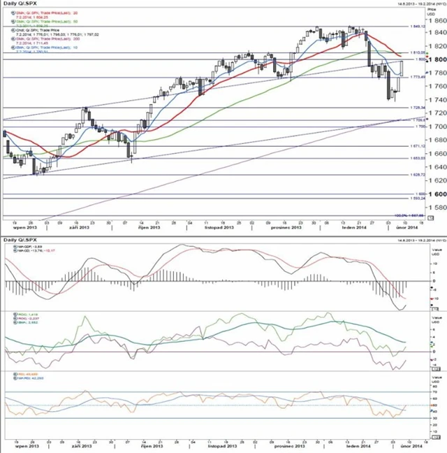 Technické indikátory celkově potvrzují zlepšení. Poklesům ale ještě nemusí být konec. Pro tento týden bude důležité, zda se index dokáže dostat nad 50denní klouzavý průměr (zelená křivka, okolo 1 810 bodů). Pokud ano, prodejní tlak pomine. Pokud ne, hrozí návrat k nedávnému lokálnímu dnu.