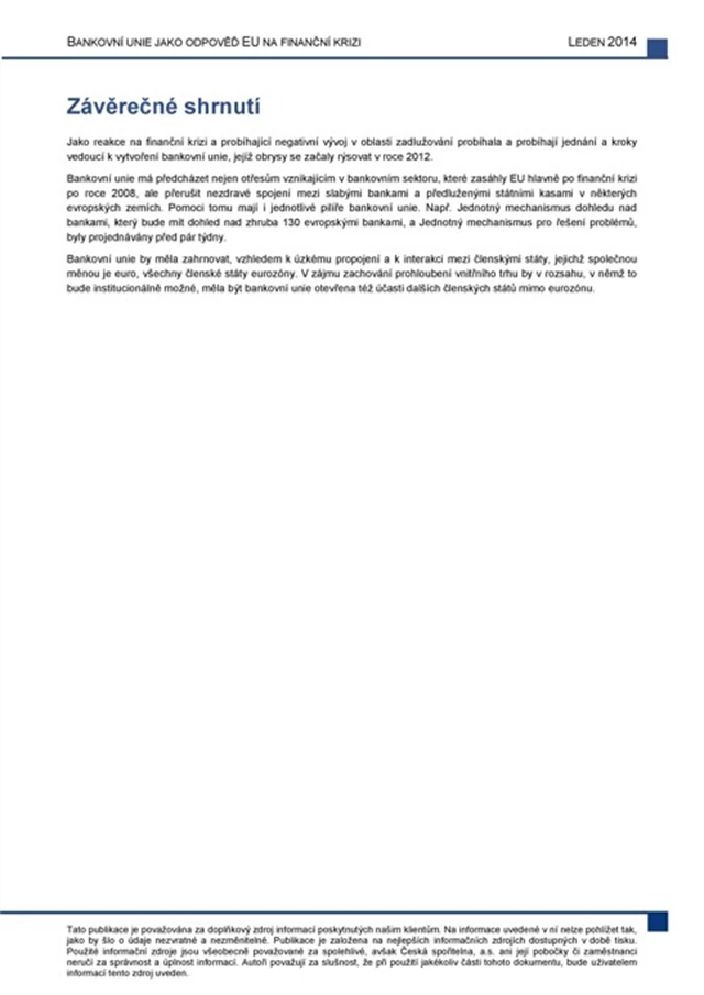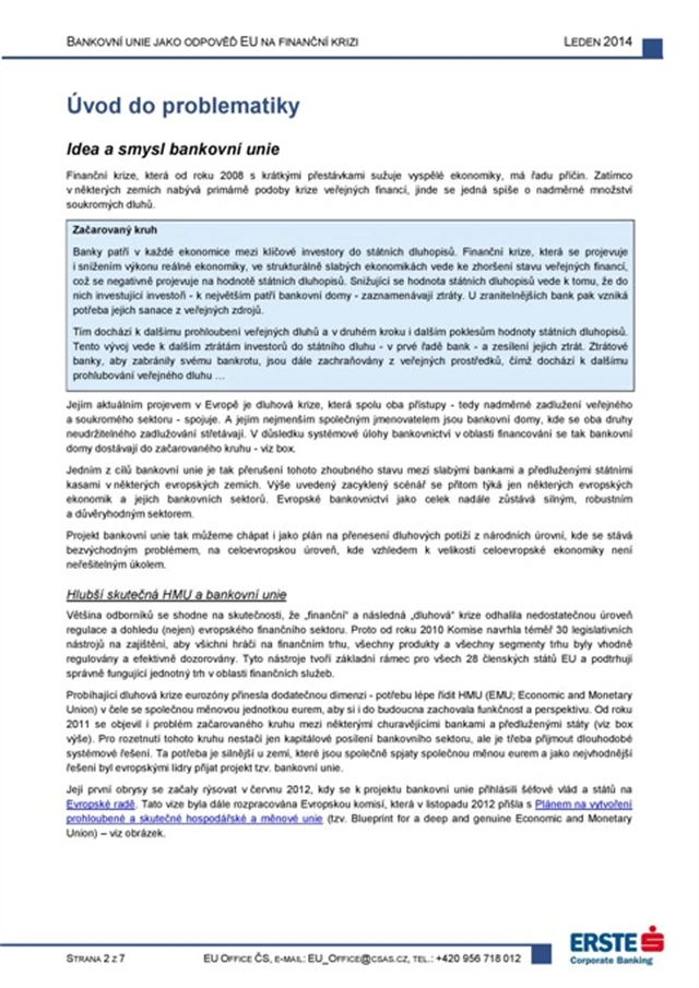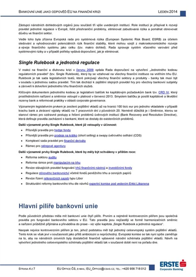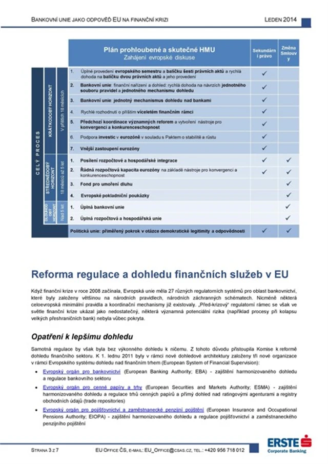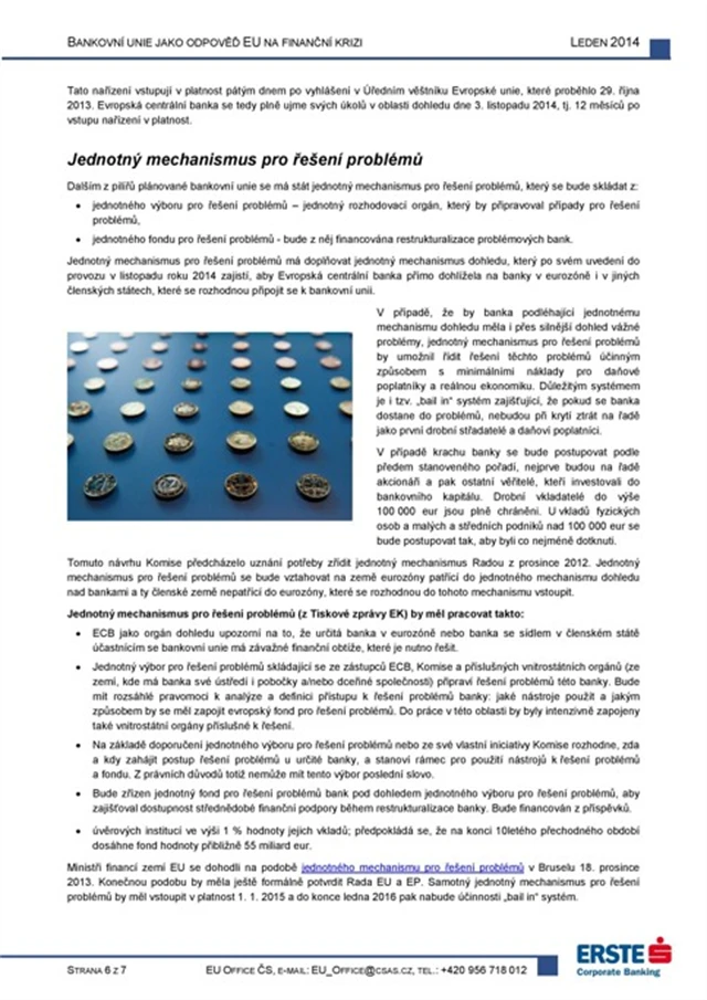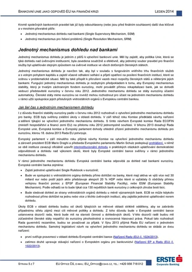 Bankovní unie má předcházet nejen otřesům vznikajícím v bankovním sektoru, které zasáhly EU hlavně po finanční krizi po roce 2008, ale také přerušit nezdravé spojení mezi slabými bankami a předluženými státními kasami v některých evropských zemích. Pomoci tomu mají i jednotlivé pilíře bankovní unie, například Jednotný mechanismus dohledu nad bankami, který bude mít dohled nad zhruba 130 evropskými bankami, a Jednotný mechanismus pro řešení problémů, které byly projednávány v posledních týdnech a měsících.