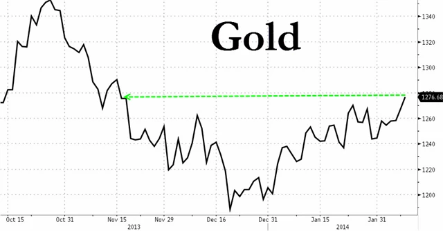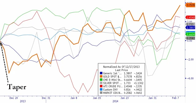Zlato je se ziskem 3,75 % nejvýkonnější z hlavních investic (dále americké akcie, americké vládní dluhopisy, americký dolar) od zahájení taperingu, tedy ústupu Fedu od programu odkupů dluhopisů. Ten začal po prosincovém zasedání FOMC.