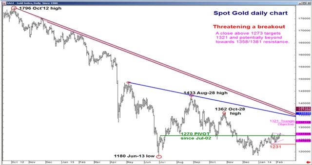 Zlatu ve svém aktuálním komentáři předpovídá růstový potenciál i hlavní technický analytik Bank of America Merrill Lynch Macneil Curry. "Denní zavírací cena nad 1 273 USD potvrzuje proražení trojúhelníkové formace a otevírá prostor pro růst k hladině 1 321 USD. Další zásadní metou je dřívější silný support mezi 1 358 a 1 381 USD za trojskou unci."