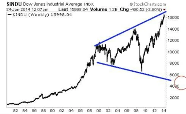 Co na to akcie? Graf indexu Dow nevěstí nic dobrého. Formace rozšiřujícího se klínu předpovídá pohyb indexu Dow k 5 tisícům bodů, možná ještě níže.