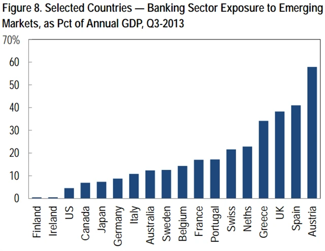 Zajímavý je graf expozice bankovního sektoru na mladých trzích. Rakouské vedení je působeno především aktivitami rakouských bank v regionu střední a východní Evropy.