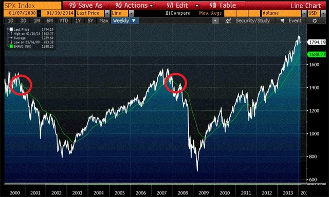 Ceny akcií jsou ale zatím k medvědímu volání hluché. Navzdory klasickým varovným signálům S&P 500 pokračoval v rally do konce roku 2013. Jako indikátor býčích a medvědích trhů může posloužit například pohled na to, jak se S&P 500 obchoduje ve vztahu k 20měsíčnímu exponenciálnímu klouzavému průměru (EMA). Pokud se index obchoduje pod linií značící EMA, jde o medvědí trh.