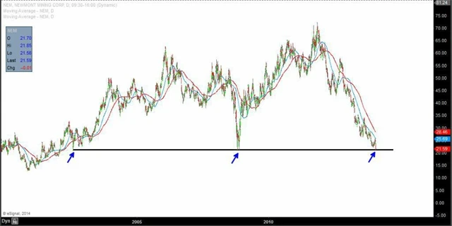Newmont Mining minulý týden oznámila, že bude její produkce v roce 2014 na horním okraji odhadovaného pásma. "Analytici ovšem ihned poukázali na to, že podle výhledu porostou firmě v roce 2014 i náklady. Její akcie se propadly ten den o 10 % a dostaly se na nejnižší úroveň od roku 2002," upozorňuje Berger. "Akcie Newmont Mining se zdají být velmi slabé. Teď bych je rozhodně nekupoval. Pokud prorazí hranici podpory mezi 21,50 a 22 USD, mohou spadnout někam k 15 USD," tvrdí.