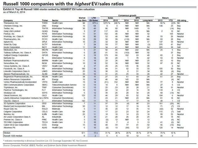 Oceňovacích modelů je celá řada. Poměr hodnoty firmy (enterprise value) a tržeb je jedním z nejpoužívanějších. Uvedené akcie letos od začátku roku posílily o více než 10 %, ale zmíněný poměr je u nich mezi 10 a 875 (!), medián 15, přičemž průměr v rámci indexu Russell 1000 je okolo 2. Najdete mezi nimi i velice známá jména.