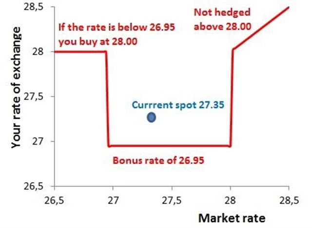 The hedging strategy will enable you to buy euros at bonus rate slightly below 27, i.e. lower rate than plain forward, as long as the koruna remain in the range of 27-2.