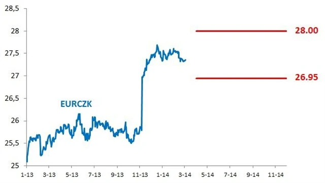Central bankers (CNB) are repeating their promise that koruna will not be stronger than 27 against the euro till at least the end of the year. Recent optimistic macro-economic figures, such as GDP in 4Q13, have not shaken their promises. The CNB is unlikely to change its FX intervention policy stance, taking into account not only ongoing macroeconomic picture in the country but also all critics the CNB has been facing since last November. An early abandonment of the floor of 27 against the euro would admit that the decision to launch FX interventions was wrong.