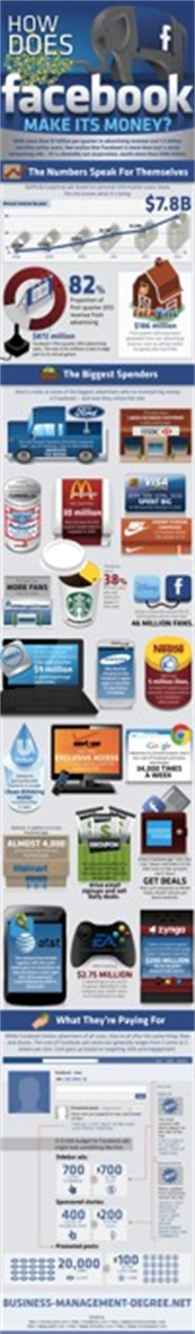 Síť s více než miliardou uživatelů má obrovský reklamní potenciál. Mezi největší inzerenty na Facebooku patří Ford, Visa, Nike, HSBC nebo McDonald's, pozadu nezůstávají ani JPMorgan, Samsung, Walmart a další.