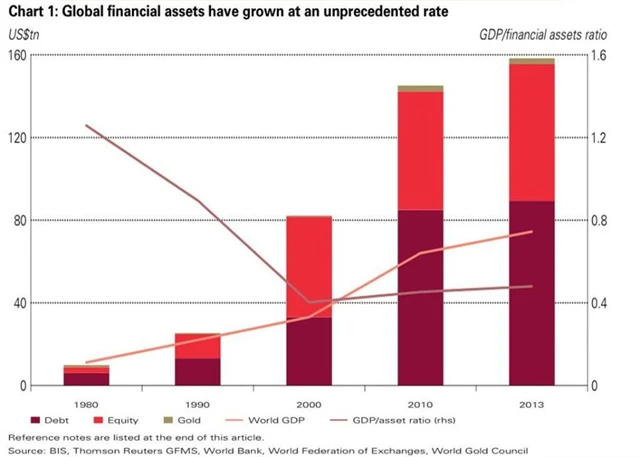 I přes vysokou volatilitu se finanční trh rozpíná do obřích rozměrů. Hodnota finančních aktiv narostla na 156 bilionů dolarů, což je násobně více než světový HDP.