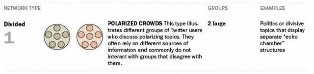 Nejjednodušší typ komunikace na Twitteru podle Pew Research Center tvoří takzvané polarizované davy (polarized crowds), tedy skupiny uživatelů, které bez vzájemného propojení diskutují o zcela odlišných (mnohdy protikladných) tématech. Mezi vůbec nejčastější témata oddělené komunikace (divided communication) patří v souladu s očekáváním politika.