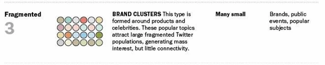Pro diskuzi související se značkami různých firem a produktů je typická roztříštěná komunikace (fragmented communication), která se vyznačuje především velmi nízkou konektivitou a vzájemnou participací jednotlivých uživatelů. Zajímavé u tohoto typu komunikace je to, že se jednotky značkových clusterů (brand clusters) shlukují kolem jediné značky, avšak předmětem jejich zájmu jsou jinak nesouvisející témata, která tedy uživatele k interakci napříč těmito clustery nijak nemotivují.