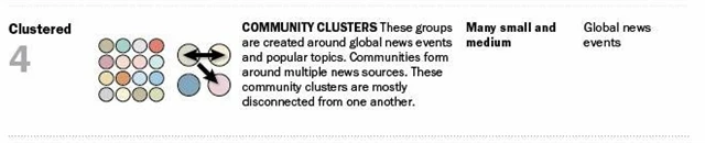 Clusterová komunikace (clustered communication) je v mnohém podobná předchozímu typu roztříštěné komunikace. Zásadní rozdíl ovšem spočívá v interakci uživatelů uvnitř jednotlivých komunitních clusterů (community culsters) a mezi těmito clustery navzájem. Participace mezi uživateli je sice stále velmi nízká a jednotlivé clustery tvoří i v tomto případě autonomní jednotky, hranice jednotlivých témat, mezi která patří zejména hlavní světové události, však již nejsou tak ostré.
