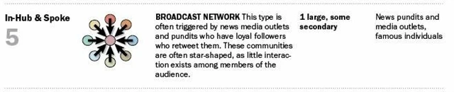 V případě zpravodajských agentur a účtů mediálních společností je nejtypičtějším druhem komunikace takzvaná komunikace dostředivá (In-Hub & Spoke). Ta je založena na vysoké loajalitě uživatelů, kteří jednotlivé zprávy agentur pouze retweetují, avšak dále nerozvíjejí. Zpravodajská struktura (broadcast network) je stejně jako roztříštěná komunikace charakteristická prakticky nulovou interakcí mezi jednotlivými uživateli skupiny.