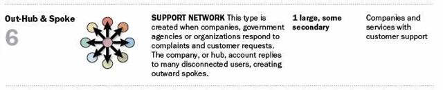 Směr odstředivé komunikace (Out-Hub & Spoke) je opačný než u komunikace dostředivé. Základním stavebním kamenem firemně-uživatelské struktury (support network) je komunikace mezi společností a zákazníkem, přičemž iniciátorem diskuze je vždy klient. Pro společnosti v rámci tohoto druhu komunikace Twitter funguje jako kanál, prostřednictvím kterého je klienti mohou kontaktovat s prosbou o radu či libovolnými připomínkami k nabízeným produktům a službám.