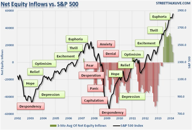 Graf pohybu peněz v amerických podílových fondech zaměřených na akcie do problému vnáší trochu světla. Drobný investor zkrátka zase jednou přišel k akciové rally až v její pokročilé fázi. Ale kdo ví, třeba ještě býci neřekli poslední slovo.