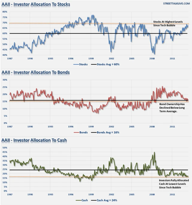 Představa, že (američtí) drobní investoři čekají mimo trh se spoustou hotovosti v ruce, je opravdu mylná. Jejich pozice v akciích jsou největší za mnoho let. Podíly dluhopisů a hotovosti v jejich portfoliích jsou naopak podprůměrné.