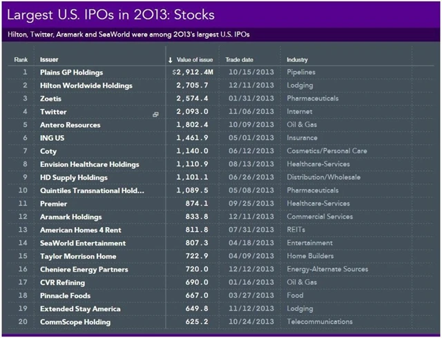 Největšího úspěchu se loni v USA podařilo dosáhnout americkému těžaři Plains GP Holdings, který při svém říjnovém vstupu na burzu získal více než 2,9 miliardy dolarů. Na druhé místo se zařadila největší světová síť hotelů Hilton Worldwide Holdings, která v listopadu prostřednictvím IPO získala 2,71 miliardy USD. A třetí firmou, která loni Twitter v objemu primární veřejné nabídky svých akcií předstihla, byla veterinární divize Zoetis amerického farmaceutického obra Pfizer, jíž vstup na burzu vynesl 2,57 miliardy USD.
