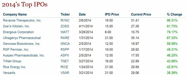 Z primárních veřejných úpisů, které proběhly v prvních čtyřech měsících letošního roku, se do čela nejúspěšnější firem na amerických trzích dostal farmaceutický podnik Revance Therapeutics vyvíjející neinjekčně aplikovatelný botulotoxin, jehož akcie se aktuálně ve srovnání s upisovací cenou 16 dolarů za kus obchodují takřka za dvojnásobek. Vstup na burzu se ale podařil i dalším firmám, například akcie sítě restaurací Zoës Kitchen od dubnového IPO posílily o více než 81 %, cenné papíry vývojáře technologie bezdrátového dobíjení elektronických zařízení Energous zdražily od konce března o necelých 80 % a o více než 50 % musejí investoři ve srovnání s lednovou, respektive únorovou upisovací cenou zaplatit také za cenné papíry biotechnologické firmy Ultragenyx Pharmaceutical vyvíjející léky na vzácná onemocnění metabolického systému a biotechnologického podniku Genocea Biosciences.