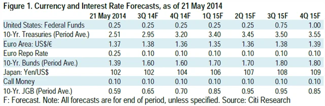 Květnový výhled ekonomů ze Citigroup hovoří jasně - sazby půjdou v eurozóně dolů již pro druhé pololetí 2014, ve Spojených státech o rok později naopak začnou růst, výnosy dluhopisů by ale měly začít růst mnohem dříve. Japonský jen bude pokračovat v oslabování. Vítězem letošního roku na trhu s komoditami je káva, ale jak na tom bude v dalších čtvrtletích? A co ostatní, mnohem sledovanější komodity?