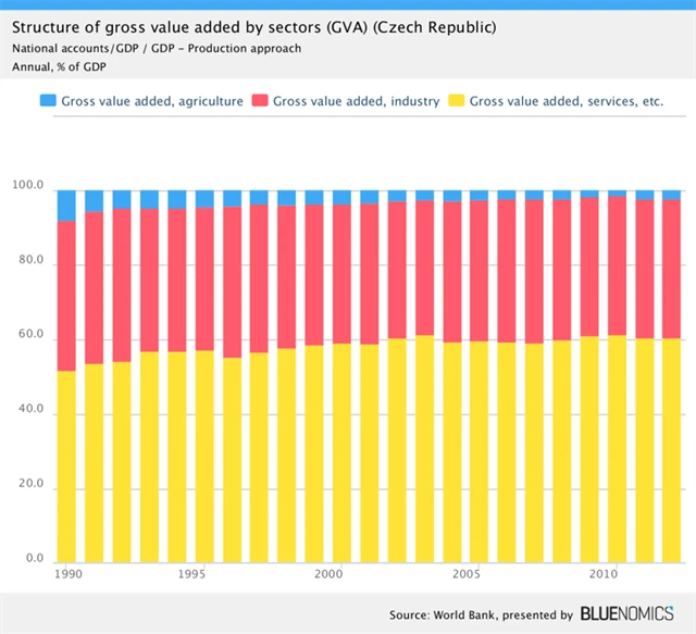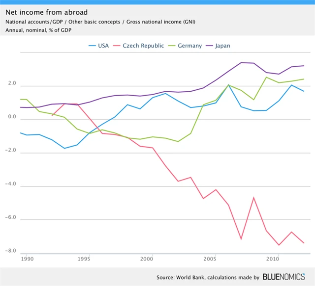Následující graf ukazuje, že u některých zemí čistý příjem ze zahraničí zaujímá vysoký podíl na HDP. Zatímco podíl čistého příjmu ze zahraniční se pro ekonomiky Japonska, Německa a USA pohybuje mezi 1,7 % a 3,0 %, v případě české ekonomiky je 7,5 % HDP převedeno do zahraničí (nejčastěji ve formě dividend placených přímým zahraničním investorům). Ve skutečnosti je tedy pouze 92,5 % českého HDP distribuováno jako příjem českým rezidentům.